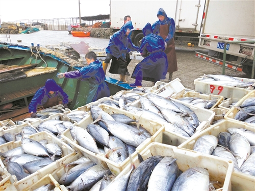 近日,在玉环市栈台渔业码头,搬运工将小船上的鲜鱼往车子上装。渔民老沈说,这些榴弹鱼、马鲛鱼、刀鱼是从鸡山岛那边运过来的,准备用运往市场。