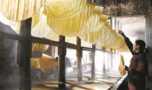 12月24日,仙居县皤滩乡下街村豆腐皮专业户方燕芬正在制作豆腐皮。豆腐皮,是台州人餐桌上常见的美食之一。由于豆腐皮吃起来十分美味,加上携带方便,营养价值高,已是当地极具代表的一大特产。