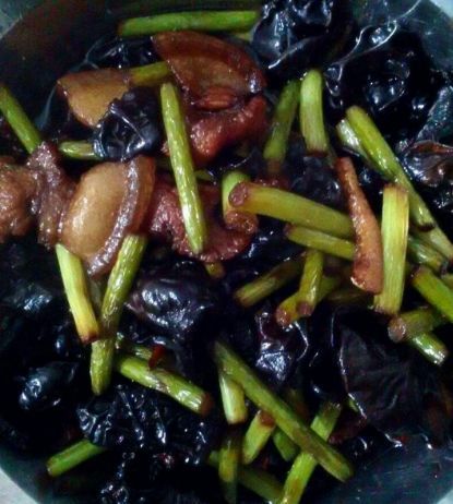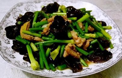 接着倒入蒜苔、木耳翻炒,加少许食盐,少许味精,大火翻炒一分钟,就可以了,出锅时可以加少许的香油,这样就更好吃了
