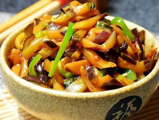 这道菜适合大火煸炒,无需加水把茄丝煸炒至软,再加各种调味料翻炒,茄子的口感才好。